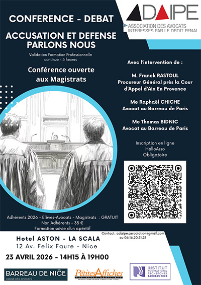 L’Association des avocats intéressés par le droit pénal (ADAIPE) organise sa conférence annuelle le jeudi 23 avril, de 14h15 à 19h00, à Hôtel Aston La Scala, à Nice.