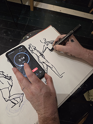 Devant leur chevalet, ils croquent le corps du modèle dans l’intimité de l’atelier du 10 rue Delille. Chez JoHa, le temps suspend son vol. À la fureur de la ville, du monde, de la réalité réelle et virtuelle, la porte reste close. Pour les initiés, l’artiste Otom donne le tempo en quelques formules lapidaires. « Ce soir, on fait 30 secondes, 1 minute, 5 minutes, 10 minutes. On commence par des dessins rapides. » Il s’adresse au modèle : « Première position : dynamique, élancée. » Ce soir-là, la jeune femme prendra une vingtaine de poses différentes pour varier les points de vue afin que les élèves puissent explorer une large palette. Otom est souvent pris dans le tourbillon des commandes de son travail d’artiste et ce moment de pause est précieux : « C’est important de venir dessiner pour le plaisir. La passion du dessin s’entretient. Travailler notre œil, intégrer les proportions, prendre le temps d’observer la lumière qui se reflète sur la peau, capter le mouvement, les dynamiques, les muscles, pour crayonner, apprendre à délier sa main… Il n’y a rien de mieux que le vivant pour toujours s’améliorer. Des corps différents d’hommes, de femmes jeunes ou moins jeunes. »
