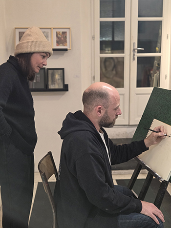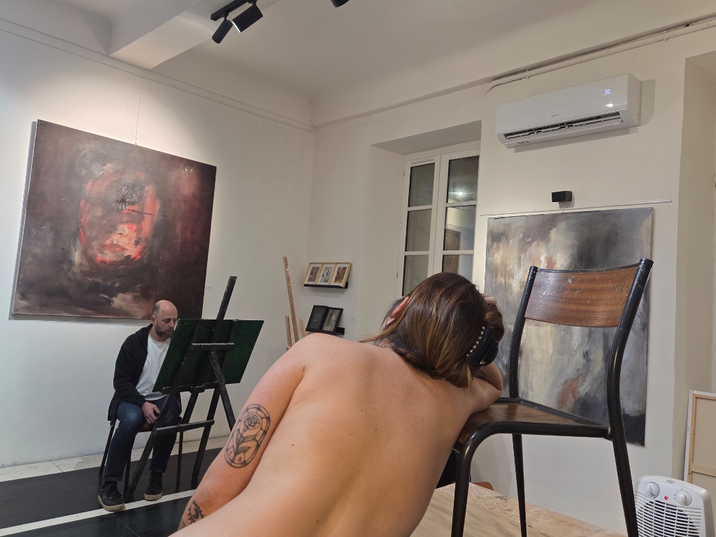 Yaël, une Franco-Américaine fréquente régulièrement ce qu’elle appelle des « drop-in » à Seattle. « Je viens à Nice passer l’hiver alors je ne peux pas m’inscrire à des cours réguliers mais ici je peux venir à la carte. C’est agréable, sans jugement, avec des artistes tranquilles, en toute liberté. » Ce soir-là, Johanna circule discrètement entre les chevalets pour distiller quelques conseils : « On apprend beaucoup avec les poses rapides, à dessiner de manière instinctive presque sans regarder sa feuille, on apprend à vite lire les directions et les orientations des membres. »