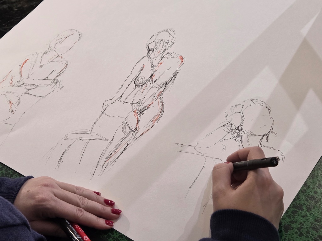 Un lundi soir au cœur de l’hiver. De la musique s’échappe d’une enceinte, sur la feuille de canson s’esquissent le galbe d’une hanche, la ligne d’un sein…
