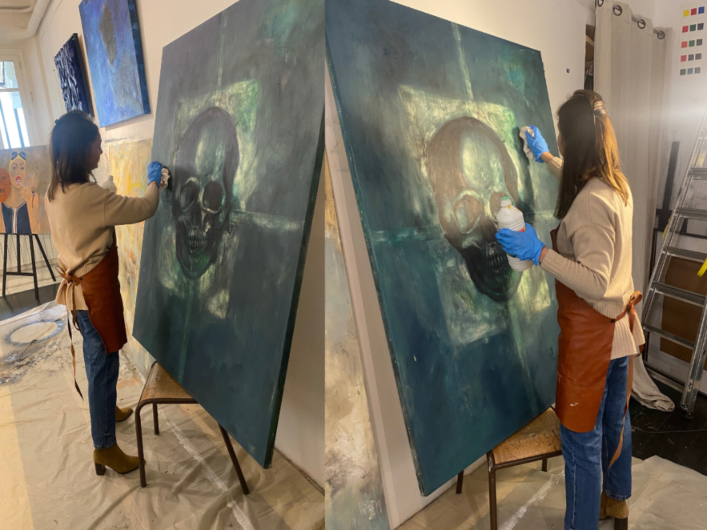 Car c’est elle, Johanna Delalay qui a donné vie à ce lieu il y a presque trois ans. Au début, elle y vivait presque, car oui, il lui est arrivé de passer des nuits blanches devant son chevalet, enivrée par l’odeur de la térébenthine, effaçant, retouchant. « On peut faire ça avec la peinture à l’huile, refaire, effacer, ça laisse des couches qui donnent à la toile une couleur et un aspect particuliers, autant d’étapes nécessaires à la création pour moi. J’ai déjà effacé des visages qui me dérangeaient. » Et naissent ainsi des visages sans figure ; sa signature. Aux Beaux-Arts, elle a commencé à peindre ses visages effacés ou douloureux. Ils lui disaient « qu’il y avait un truc qui n’allait pas. En effet je n’arrivais pas à mettre des mots sur ce que je ressentais. J’effaçais un œil pour pas voir la réalité et inconsciemment ça ressortait comme ça ».