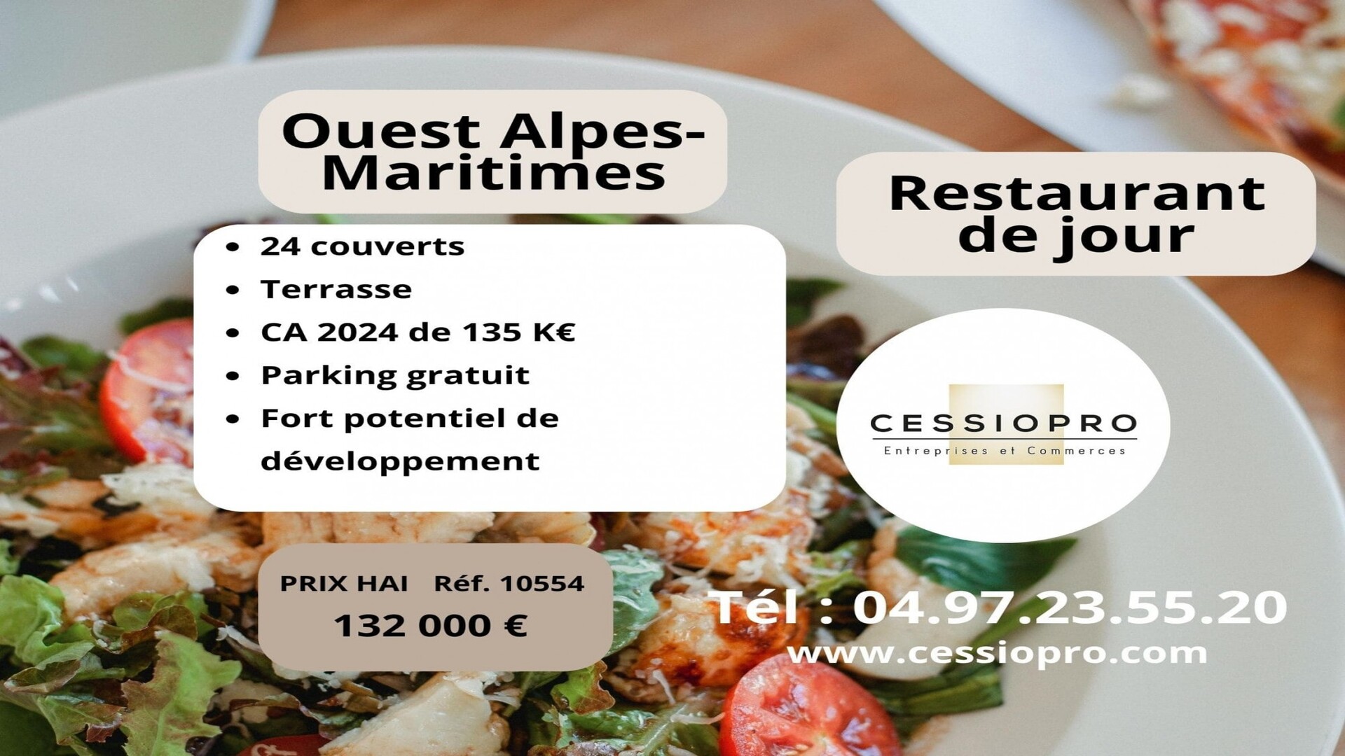 A SOPHIA ANTIPOLIS, à vendre le fonds de commerce d'un restaurant en service du midi (Du lundi au vendredi) d'un capacité de 92 couverts dont 36 en terrasse. Loyer modéré pour la zone de 1115EUR/mois comprenant l'eau et la taxe foncière. Le CA avant COVID était de l'ordre de 130 000EUR. Idéal couple de professionnel. A la vente au prix de 121000EUR honoraires du Cabinet inclus Prix hors honoraires de 110000EUR Honoraires à charge acquéreur de 10% TTC soit 8.33% HT