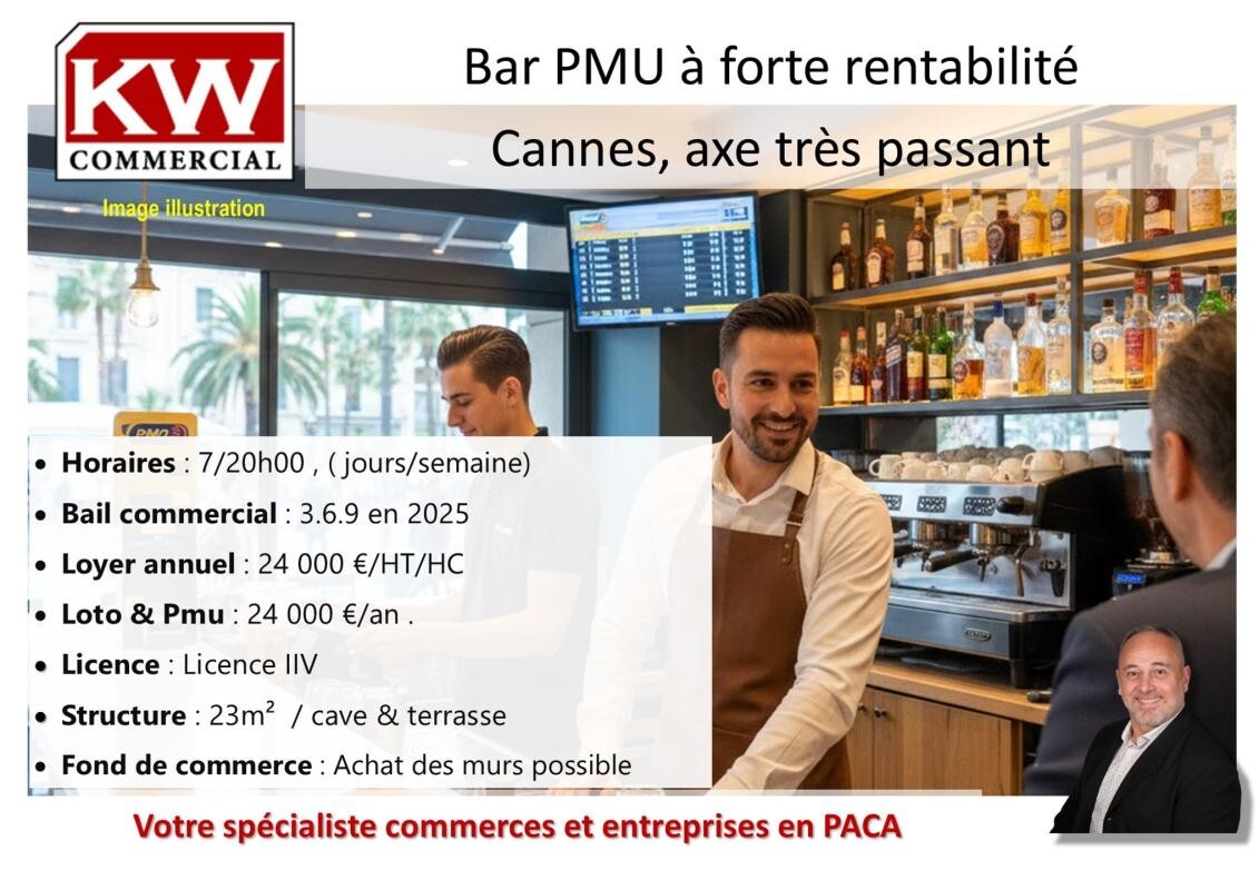 BAR PMU LICENCE IV CANNES - L'INVESTISSEMENT RENTABLE SUR BOULEVARD CARNOTSaisissez une opportunité d'investissement exceptionnelle sur le Boulevard Carnot à Cannes. Ce Bar PMU Licence IV bénéficie d'un emplacement stratégique N°1, garantissant une clientèle locale fidèle et un flux de passage constant, un facteur clé pour la pérennité de l'activité sur la Côte d'Azur. Cette affaire est idéale pour un couple d'exploitants ou un investisseur cherchant un commerce ultra-rentable et facile à gérer.La force de cet établissement réside dans sa performance financière, bien au-delà des standards du marché. L'activité affiche un Chiffre d'affaires HT annuel situé entre 128 000 € et 135 000 €. Plus significatif encore, l'Excédent Brut d'Exploitation (EBE) dépasse les 55 000 € par an, et la Marge EBE est constamment maintenue entre 43 % et 50 % (contre 20 % à 35 % en moyenne nationale). Avec un Résultat net comptable supérieur à 38 000 €, cet actif financier est sécurisé, performant et prouve une exploitation optimisée avec des charges strictement maîtrisées.Malgré son fort rendement, ce fonds de commerce offre un équilibre de vie recherché. Les heures d'ouverture modérées (fermeture quotidienne à 20h00, sans service du soir) permettent des congés réguliers. Le local de 23 m² est optimisé et complété par une terrasse ensoleillée offrant 12 places. Le Bail commercial est neuf, avec un loyer de 2 000 € HT/HC. Des potentiels de croissance existent (horaires élargis, petite restauration), et, pour une sécurité maximale, les Murs Commerciaux sont disponibles à l'acquisition en option.Le prix est négociable si l'offre est sérieuse et sans condition suspensive de crédit.L'étude du dossier financier complet est essentielle pour apprécier la pleine mesure de cette rentabilité. Contactez-nous pour échanger sur les performances détaillées et organiser une visite confidentielle de cette affaire rare.
