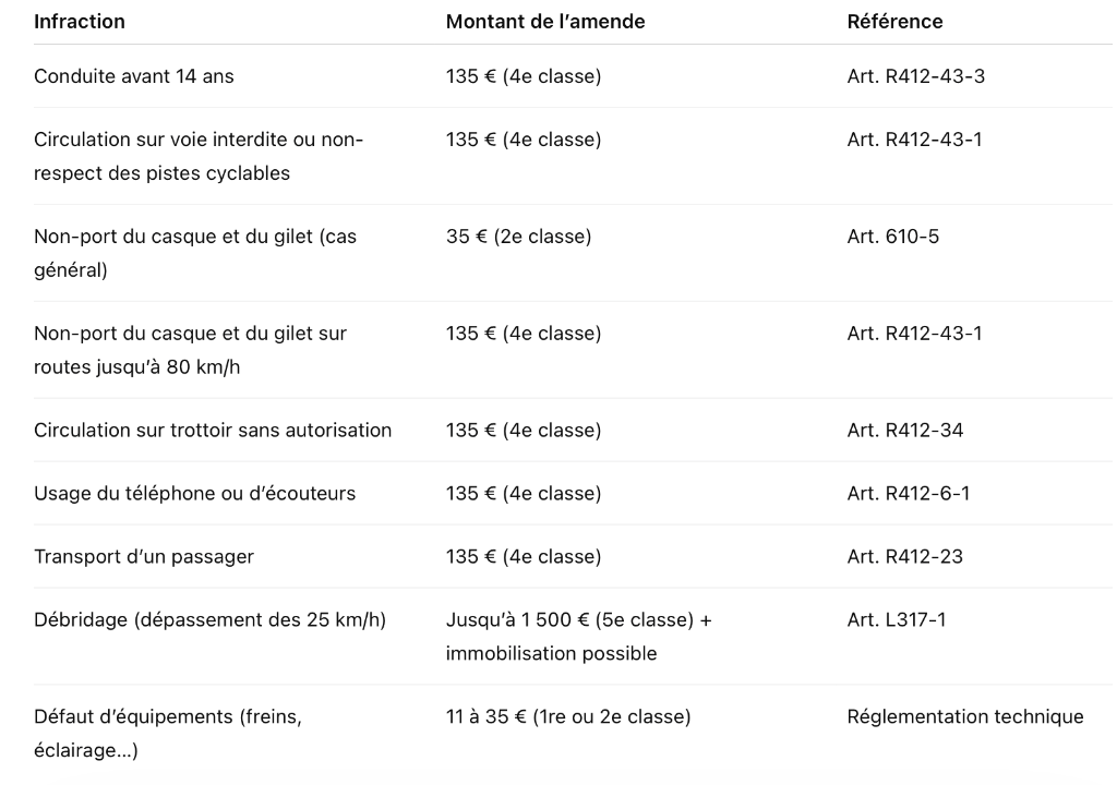 Par ailleurs, plusieurs règles de circulation s’appliquent : vitesse limitée à 25 km/h, interdiction de circuler sur les trottoirs (sauf exception), obligation d’emprunter les pistes cyclables lorsqu’elles existent, et interdiction du transport de passagers ou de l’usage du téléphone en roulant.