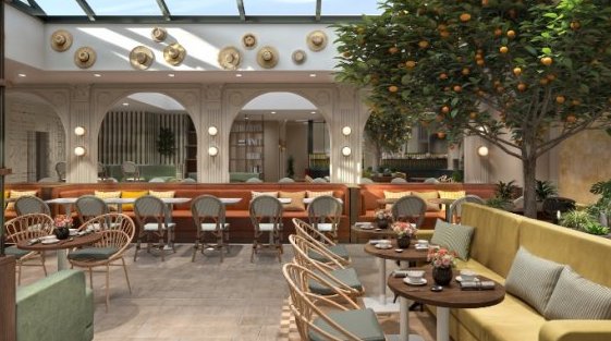 La rénovation intérieure a été confiée à l’architecte d’intérieur Marie-Paule Clout. L’approche décorative s’inspire des codes de la Belle Époque, associés à une palette de tons naturels et méditerranéens. Les espaces communs sont conçus comme les différentes pièces d’une demeure de villégiature : sas d’entrée traité comme un porche haussmannien, réception intimiste, espaces de restauration évoquant une cuisine méditerranéenne, et salle de petits-déjeuners aménagée sous verrière, éclairée par la lumière naturelle.