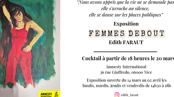À partir du 14 mars, les murs d’Amnesty International à Nice accueilleront l’exposition « Femmes debout » d’Edith Faraut. Avocate de profession et artiste par passion, elle présente une série d’œuvres engagées célébrant la force, la dignité et la liberté des femmes.