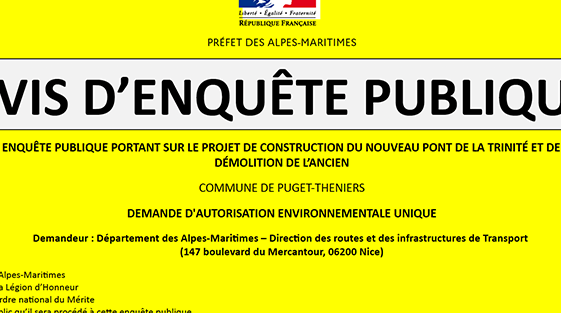 Une enquête publique va être organisée dans les Alpes-Maritimes afin de recueillir l’avis du public sur le projet de construction d’un nouveau pont de la Trinité et la démolition de l’ouvrage existant, sur la commune de Puget-Théniers.