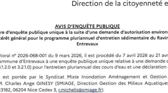 Par arrêté préfectoral n° 2026-068-001 du 9 mars 2026, il est procédé du 7 avril 2026 au 21 avril 2026 inclus, sur le territoire de la commune d’Entrevaux à une enquête publique unique relative à une demande d’autorisation loi sur l’eau (rubriques 3.1.2.0 et 3.2.1.0) pour l’entretien pluriannuel des cours d’eau et une déclaration d’intérêt général. Cette opération est portée par le Syndicat Mixte Inondation Aménagement et Gestion de l’Eau (SMIAGE) représenté par M. Charles Ange GINESY (SMIAGE, Direction Gestion des Milieux Aquatiques, 147 Boulevard du Mercantour, CS 23182, 06204 Nice Cedex 3, [email protected]).